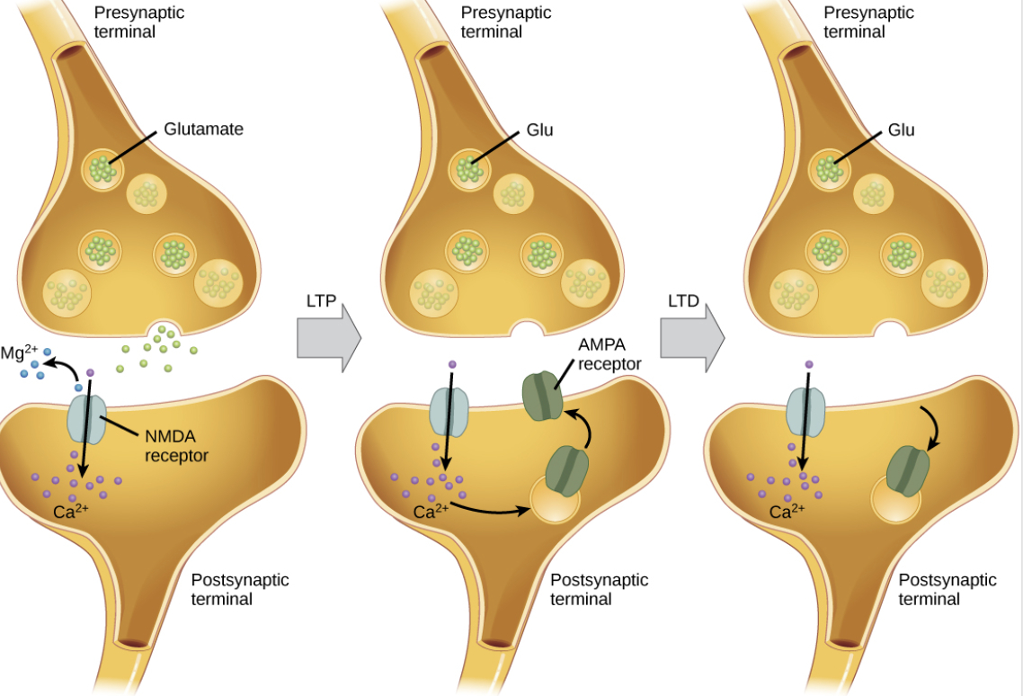 If there is only a small depolarization of the postsynaptic neuron, magnesium and zinc will only be partially dislodged to allow a small number of calcium ions to enter the cell. The calcium ions act as second messengers in this case, that temporarily recruit more AMPA receptors to the postsynaptic neuron. The number, activity, and position of AMPA receptors are dynamically changing constantly so that glutamatergic nerves can adjust their strength and activity to external needs and conditions. When more AMPA receptors are recruited to the postsynaptic neuron, this increases the chance for future depolarizations. This AMPA-recruitment effect is short-lived though. It only lasts for a few hours. As such, it is known as “short-term potentiation”.